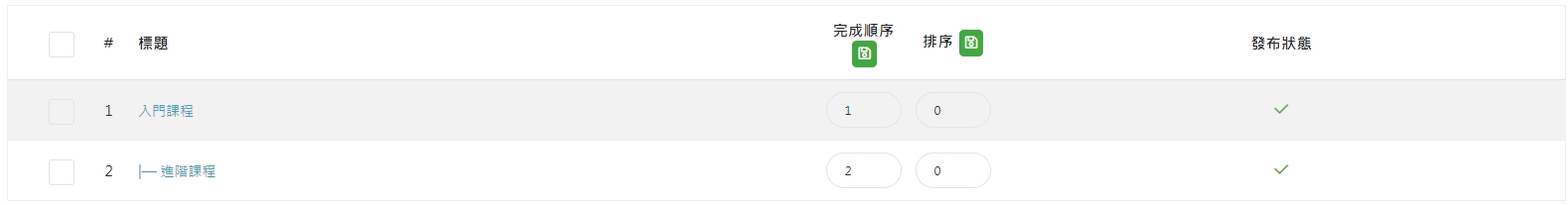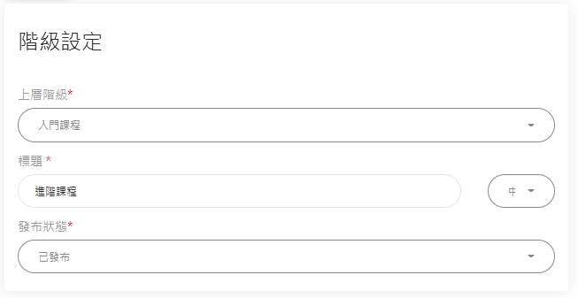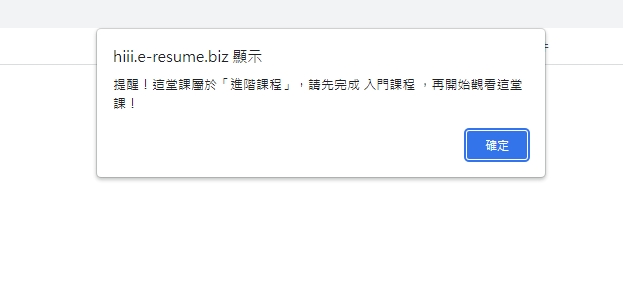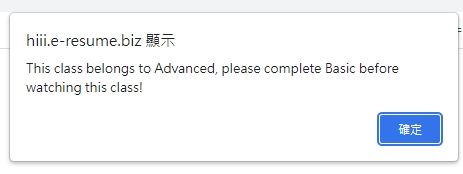 課程階級管理 [新增] 階級設定── 上層階級:新階級歸屬於所選階級下 標題 發布狀態:發布表示啟用此階級 [操作方式] 填寫階級設定後,記得按下「儲存」或「儲存&關閉」或「儲存&新增」,才會新增階級! [列表] 1.入門課程為進階課程的上層階級 2.完成順序表示同分類下的課程階級順序,同分類課程要先完成順序數字較小的課程才能上完成順序數字較大的課程 前台測試 此會員有e-Learning分類的入門課與進階課權限 目前入門課程尚未上完,點選進階課會出現提醒視窗 英文版內容