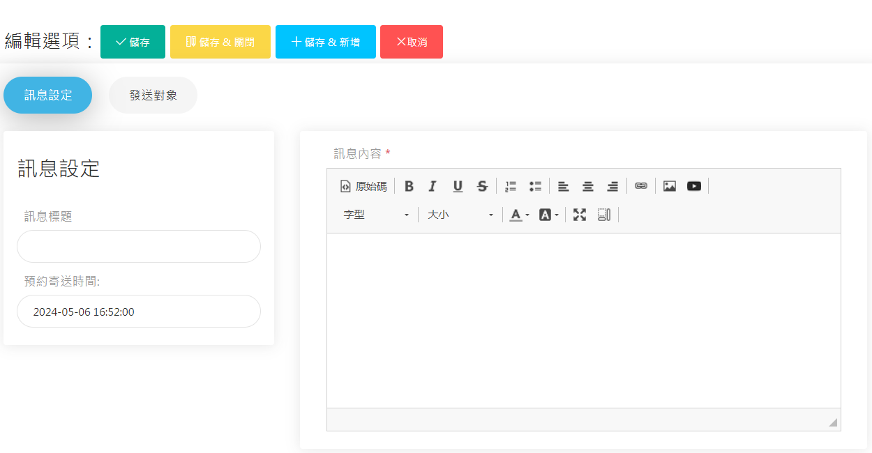 如何設定通知管理? 1.點選網站管理內的通知管理: 2.新增通知管理: 預約寄送時間:可預先排定時程發送信件 設定訊息標題、內容 3.設定發送對象 匯入客戶:選擇後台既有的會員做批次篩選及匯入 新增發送對象:直接輸入EMAIL、名稱(可輸入非會員的郵件) 直接發送:無視預約寄送時間直接發送訊息