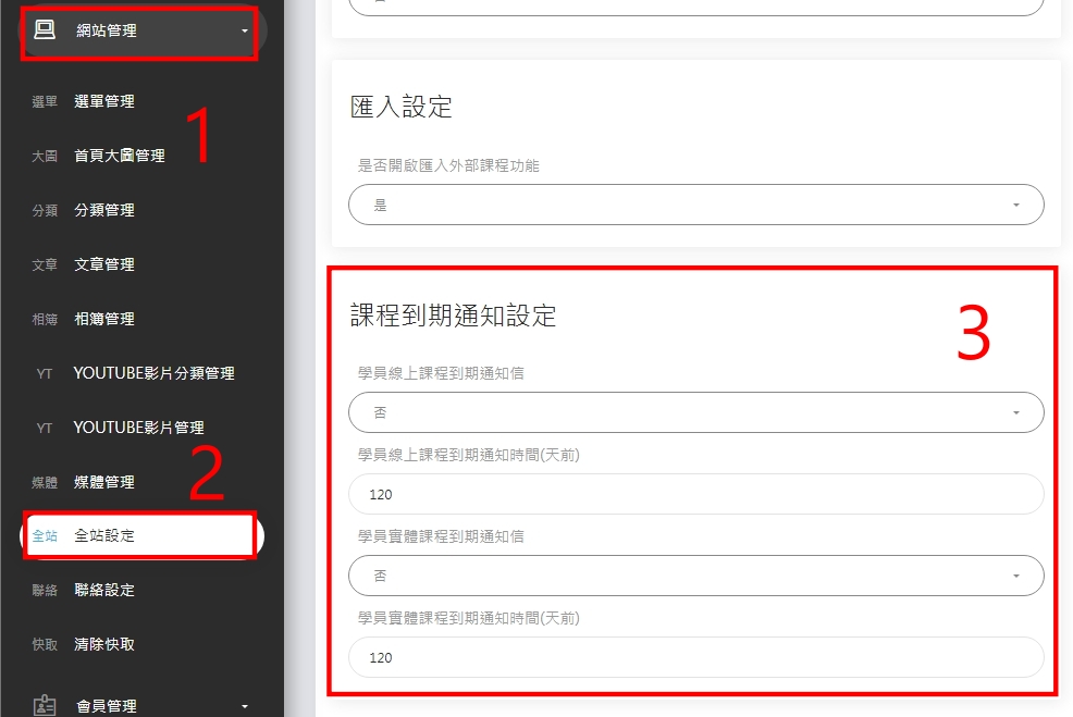 如何設定課程到期通知? 後台>網站管理>全站設定>課程到期通知設定 學員線上課程到期通知信 : 設置是否需要通知信 學員線上課程到期通知時間(天前) : 幾天前(含當天)開始"每天"傳送通知EMail至會員註冊的Mail