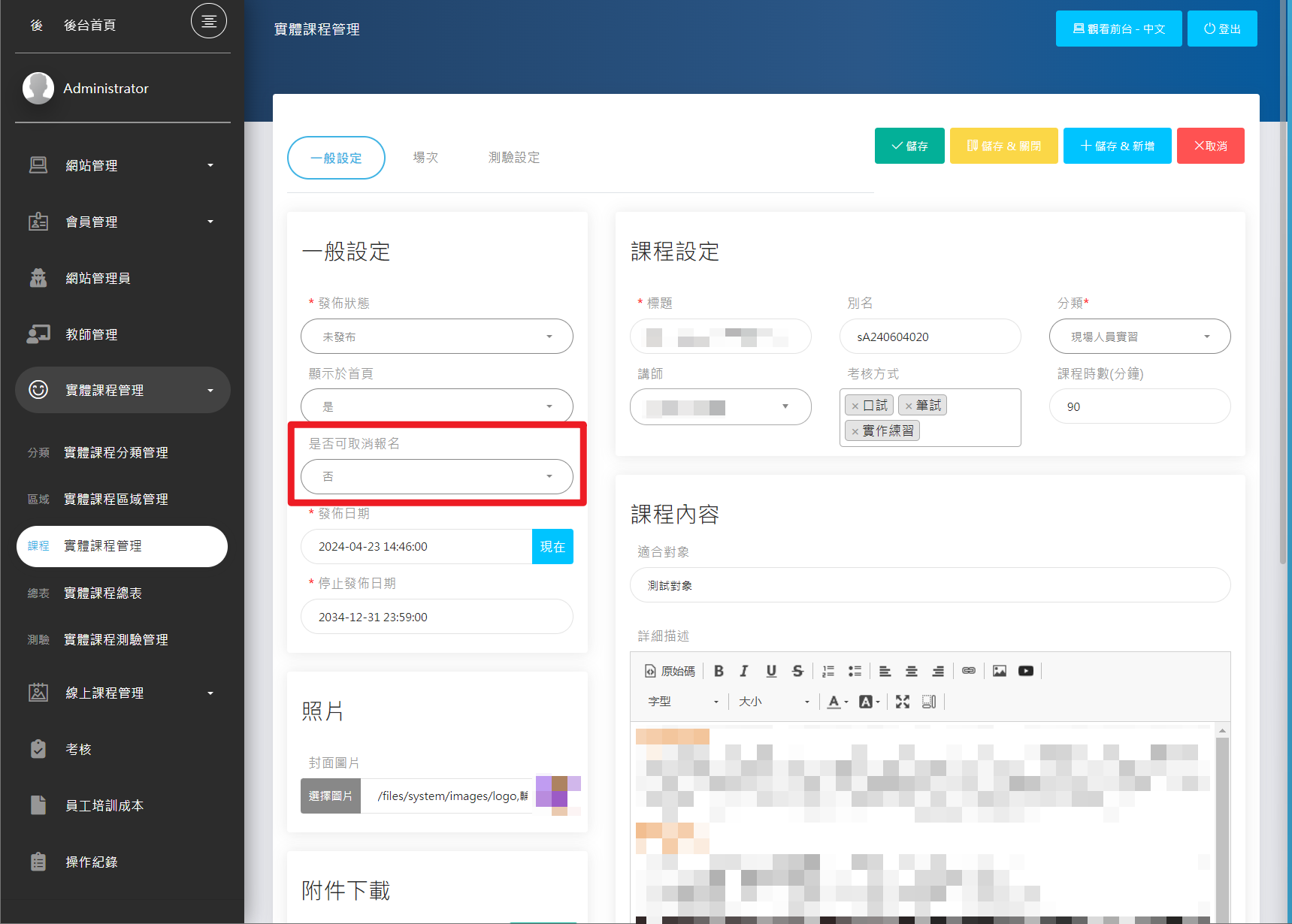 後台>實體課程管理>課程設定內頁