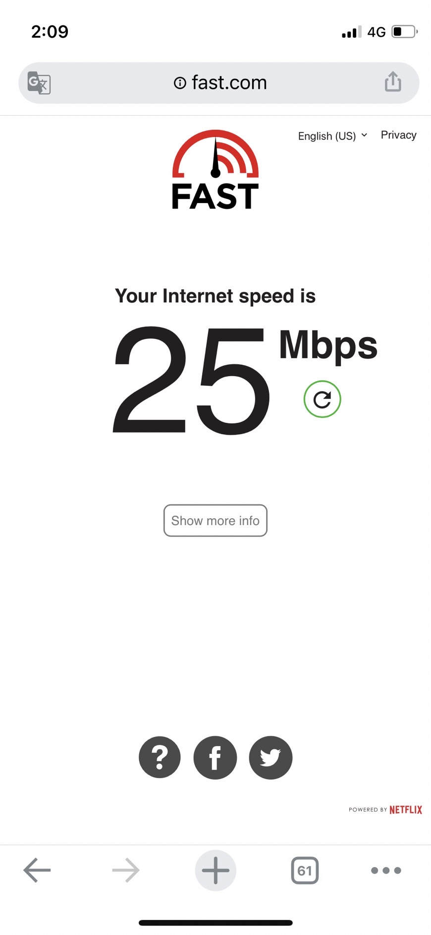 請連線至此網址測試您的網速 https://fast.com/ (開啟網頁後數字應大於 25)